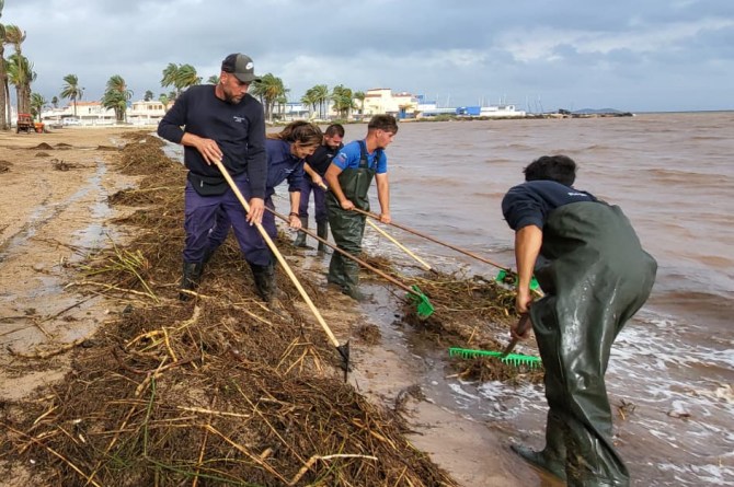 Desde el inicio del episodio, 135 efectivos dependientes de la consejería de Medio Ambiente han participado en las labores de retirada de biomasa, cañas y otros materiales arrastrados por las ramblas hacia las orillas del Mar Menor. En la jornada de este lunes están desplegados 90 operativos, que trabajan sobre distintas playas y zonas del litoral más afectadas. Las brigadas de limpieza están desplegadas en las playas de Los Urrutias, Los Nietos e Islas Menores.